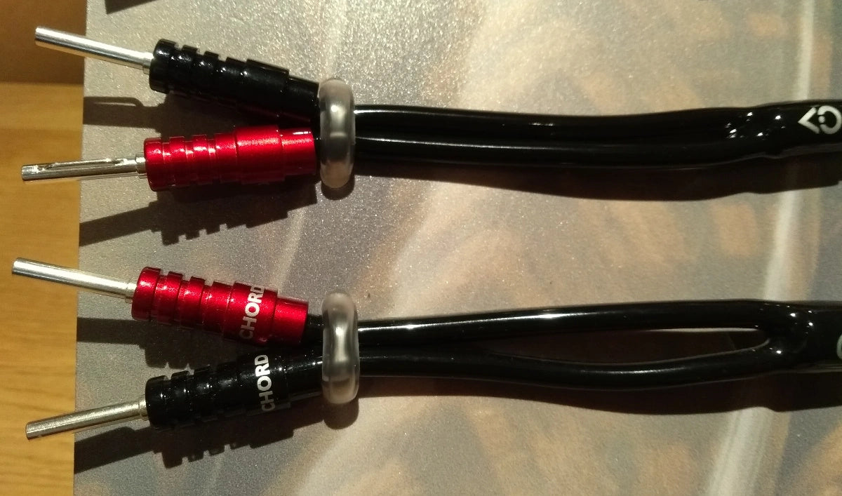 Los conectores de altavoz ChordOhmic ChorAlloy™ enchapados en 4 mm y pala están diseñados para brindar beneficios eléctricos y sonoros a los cables de bocina  en todas partes. Contacto óptimo a través de terminación de crimpado hexagonal. Los enchufes se incluyen de serie en todos los nuevos juegos de cables de altavoz de Chord Company, así como disponibles por separado como una actualización para mejorar los cables existentes de Chord Company o cualquier otra marca de cable.