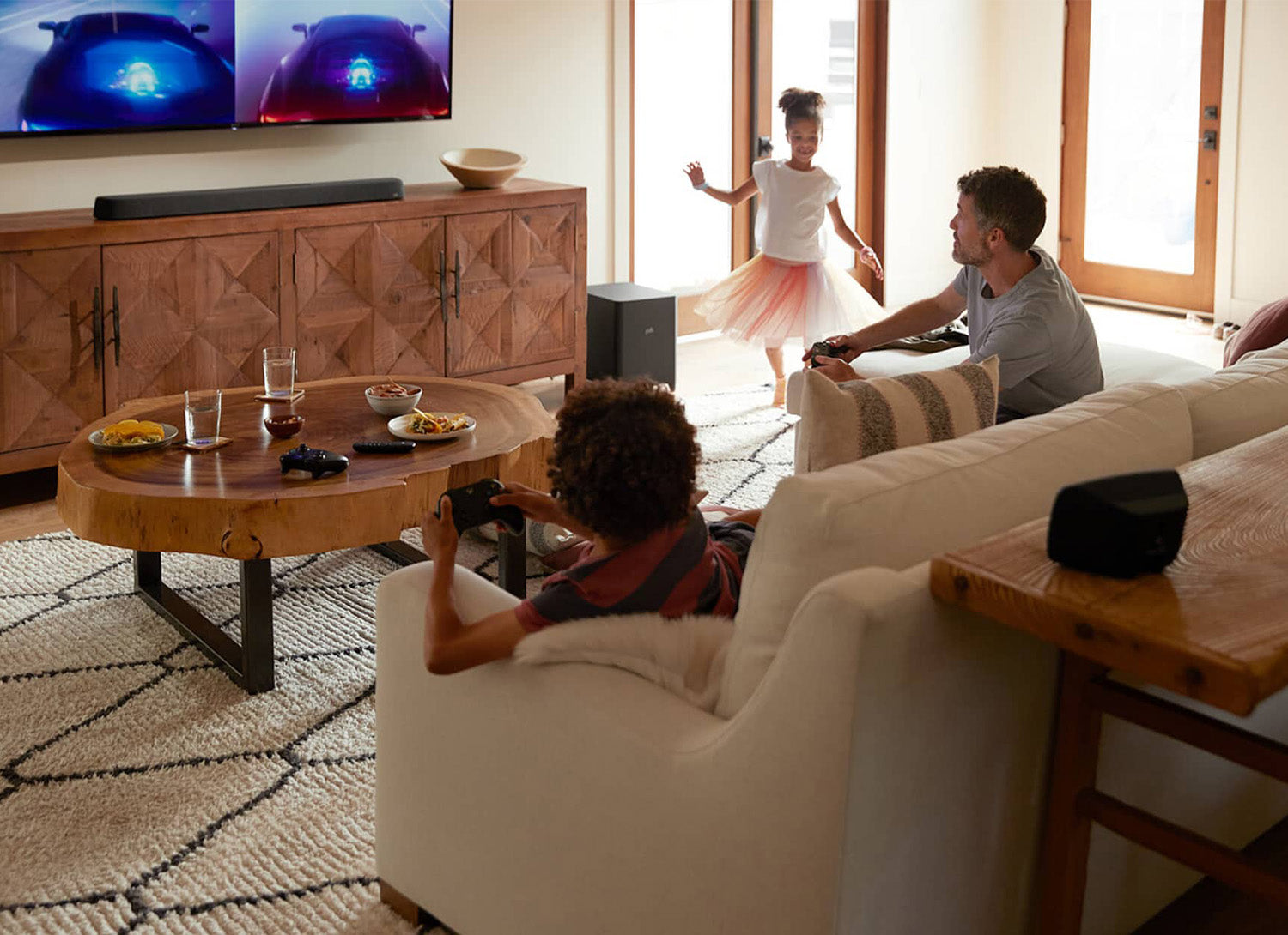 Disfruta de un sonido envolvente optimizado con SDA en 7.1.2 Dolby Atmos y DTS:X con nuestra barra de sonido de 11 altavoces, rodeadores inalámbricos y subwoofer. Incluye transmisión de música a través de Wi-Fi y Bluetooth.